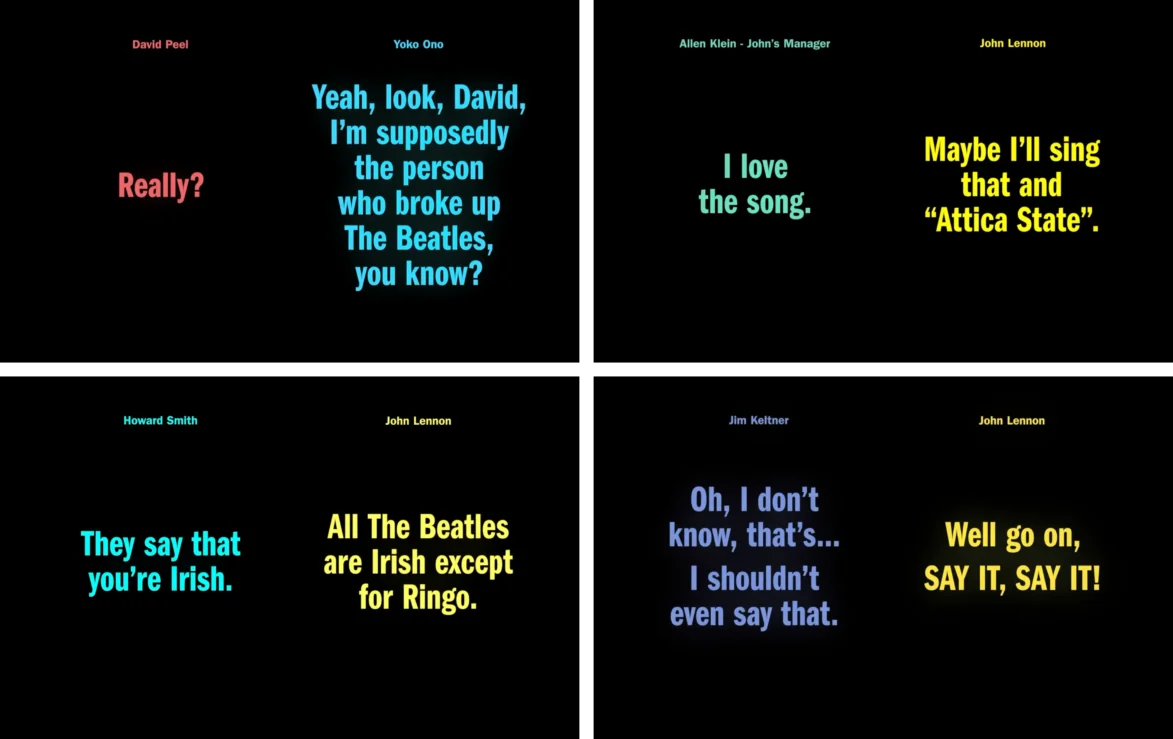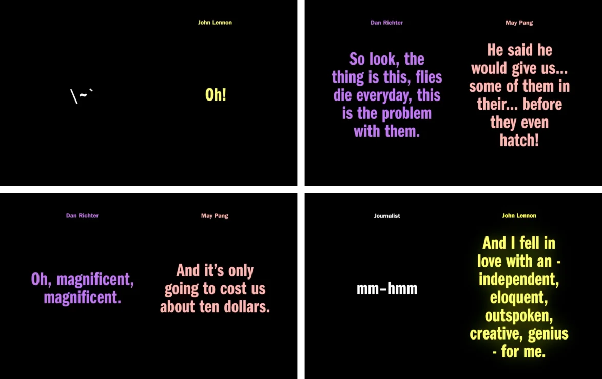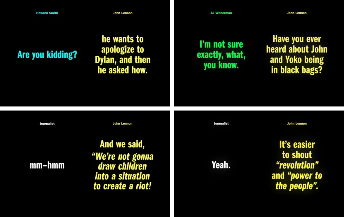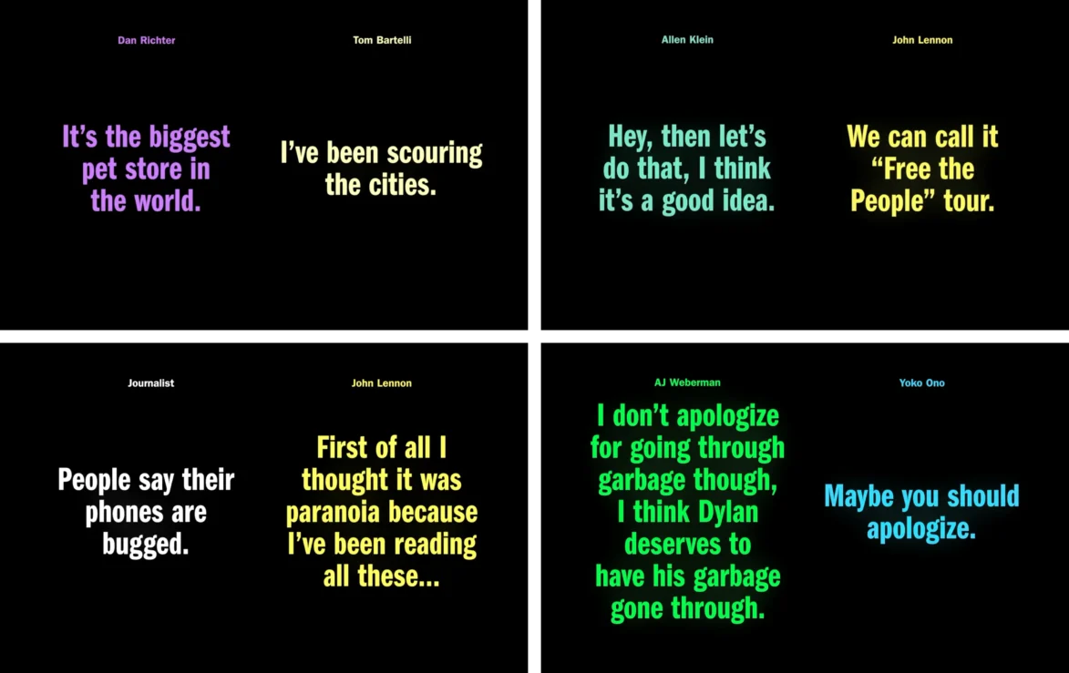 The phone calls were the main use of Franklin Gothic, visuals are animated word for word, “like a game of Pong” and individuals are colour-coded for clarity – Lennon is yellow, like the famous submarine.